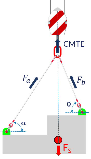 A expressão trigonométrica de CMTE é o fator de uso (Fu), constante para uma determinada geometria, usado no cálculo imediato da CMTE para linga de qualquer material, seja de cabo de aço, cinta têxtil, corrente, cabo de HMPE e outros materiais, bastando multiplicar esse fator pela CMT da linga de uma perna na vertical.