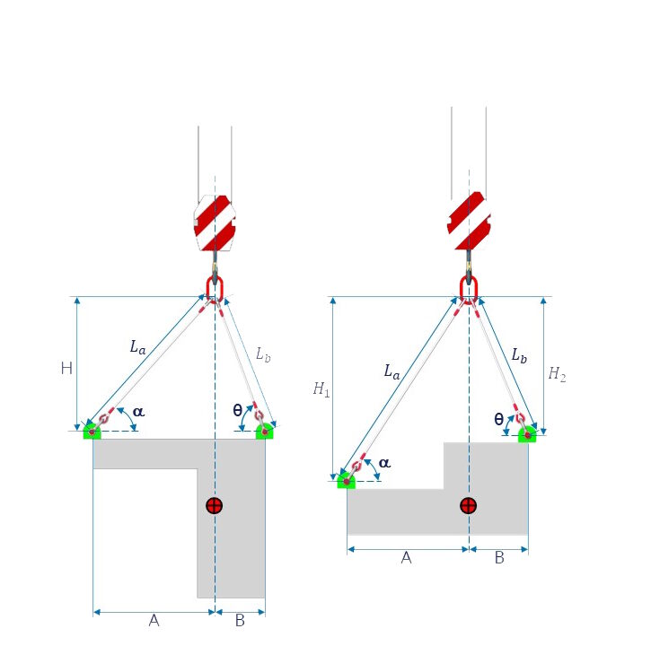 Para lingas com pontos de içamento nivelados, basta substituir, nas equações acima, H1 e H2 por H.