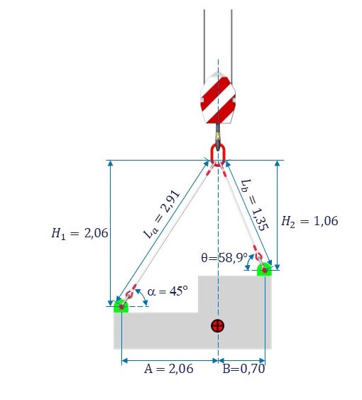 A e B são as distâncias horizontais dos pontos de içamento ao centro de gravidade.