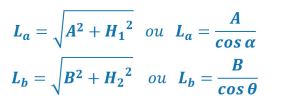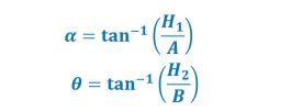 Supondo que sejam conhecidas as dimensões A, B, H1 e H2, determinam-se os ângulos de inclinação com a horizontal: