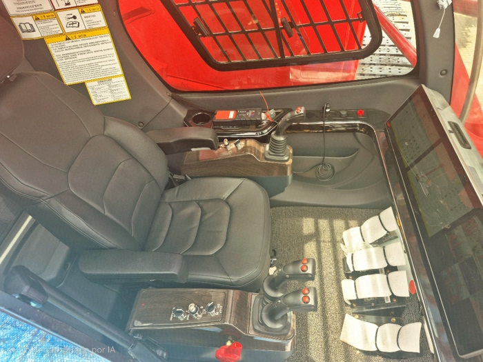 A cabine de operação, por sua vez, possui assento ampliado (450 mm), ajuste elétrico multidimensional, inclinação de até 140° e espaço de pernas ampliado em 30%, permitindo que o operador descanse entre ciclos de operação e mantenha a concentração em longas jornadas.