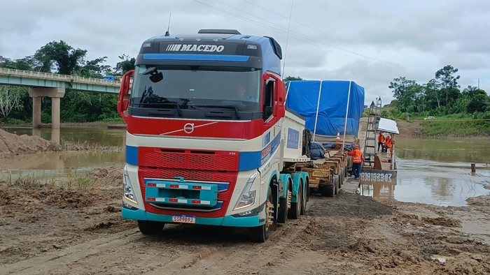Mesmo diante de um cronograma desafiador e da coincidência com o período de festas de fim de ano, o transporte foi concluído em 45 dias, com a chegada dos equipamentos à cidade de Sena Madureira (AC). A partir desse ponto, a equipe da Macedo enfrentou uma importante barreira logística: uma ponte sobre o Rio Caeté que não estava habilitada para suportar o peso das cargas transportadas. Diante dessa limitação estrutural, a empresa já havia identificado e locado por antecipação uma balsa especialmente para a travessia de aproximadamente 800 metros, em um mesmo dia, das duas composições de transporte. Toda a operação foi acompanhada de perto por agentes do Departamento Nacional de Infraestrutura de Transportes (DNIT), garantindo total segurança e conformidade com as normas vigentes. Após o cruzamento do rio, em apenas dois dias, os dois compensadores chegaram ao cliente dentro do prazo previsto.
