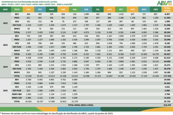 O grande destaque de maio foram os BEV, que registraram recorde de venda, com um total de 6.969 veículos, aumento de 48,2% em relação a abril (4.702). Na comparação com maio de 2024 (5.175), esse crescimento foi de 34,7%.