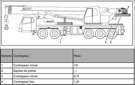 Conforme a Figura 1, retirada deste manual, a peça do contrapeso fixo de 1,3 toneladas (4) e a peça do contrapeso móvel de 9,7 toneladas (3) podem ser instaladas na estrutura superior do guindaste. A peça de contrapeso móvel de 12,0 toneladas (1) e as sapatas das patolas (2) devem ser acomodadas na estrutura interior.