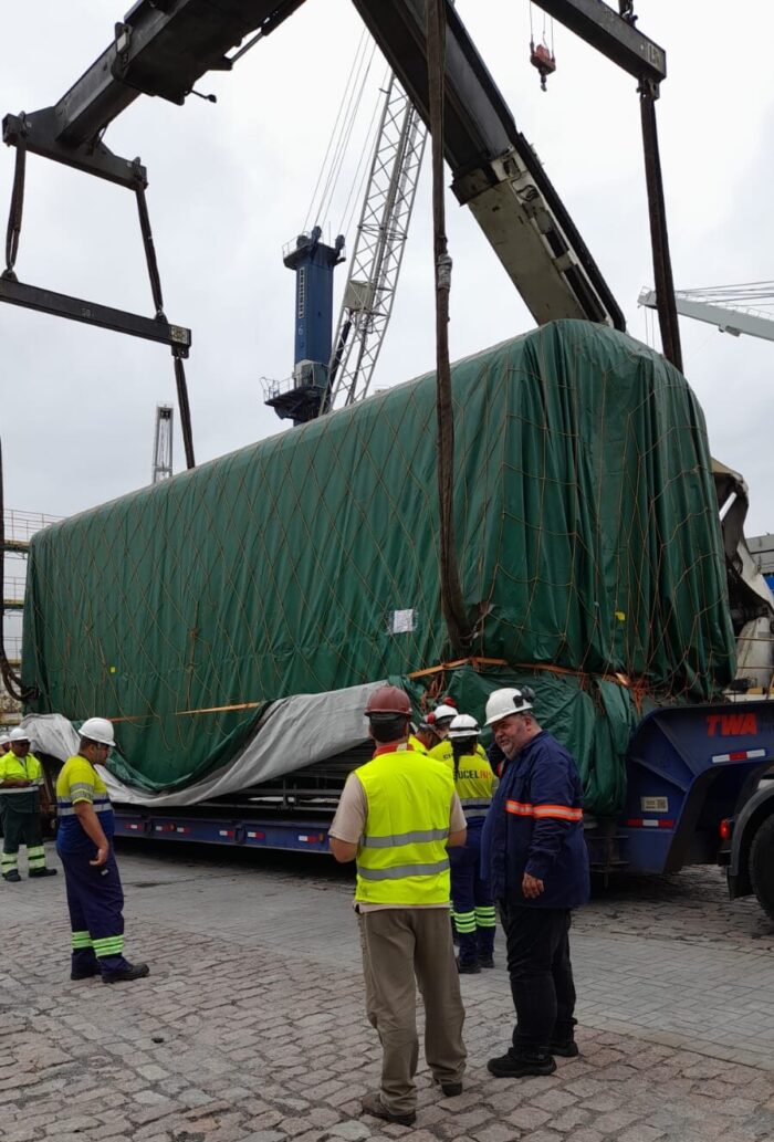 Restrições de altura e pontos de manobra levaram à adaptação dos conjuntos transportadores. A equipe técnica elaborou planos de rigging, definiu rotas e acompanhou o trajeto do porto ao posicionamento nos trilhos.